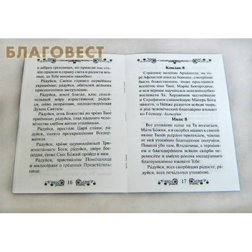 Данное издание содержит акафист Пресвятой Богородице в честь иконы Ее «Достойно есть». Перед образом Божией Матери «Достойно есть» («Милующей») особо молятся о прощении грехов, в том числе и смертных.