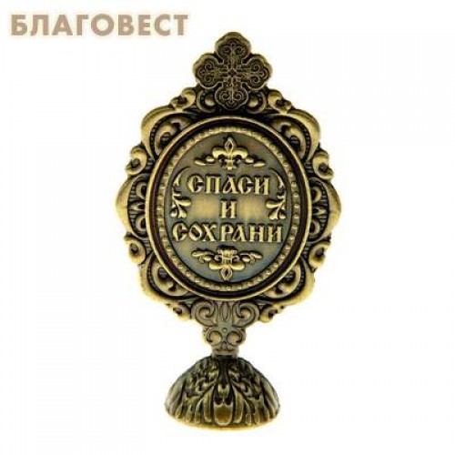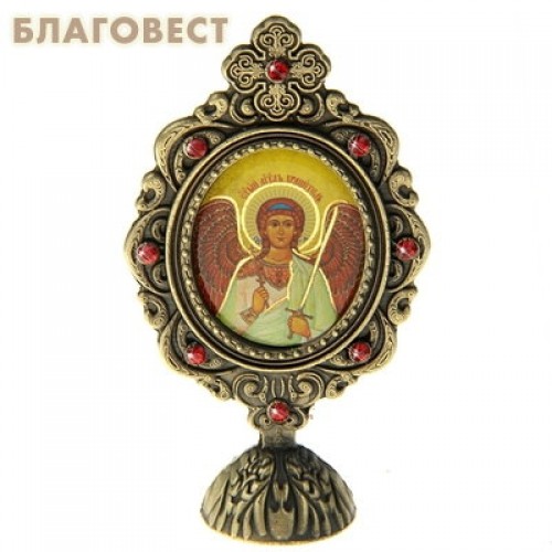 Икона вставлена в металлическую литую овальную рамку на круглой подставке. Рамка украшена стразами. Сверху рамку венчает 4-х конечный Крест.