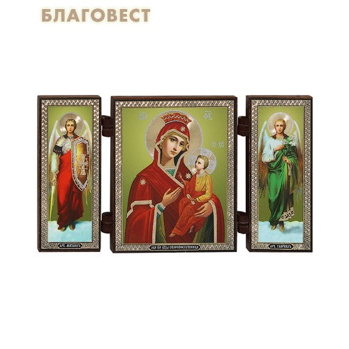 Предлагаемый складень имеет своим центральным образом икону Божией матери именуемой Скоропослушница. Слева и справа расположены иконы архангелов Михаила и Гавриила. Празднование иконе Скоропослушница установлено в Церкви 22 ноября по новому стилю. Впервые этот образ прославился на Афоне в Дохиарском монастыре, но позже появилось еще несколько чудотворных списков с нее. Перед этим образом принято молится в тяжких болезнях, так как известны даже исцеления больных онкологией. Так как даже само наименование иконы Скоропослушница говорит о том, что от образа этого верующие особенно скоро получают помощь, то наиболее часто молятся перед этой иконой в тех обстоятельствах, когда промедление опасно и помощь Богородицы нужна как можно скорее.