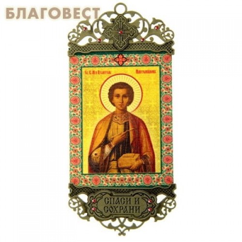 Икона-хоругвь "Великомученик и целитель Пантелеимон " изготовлен из холста с нанесенным полноцветным изображением и приклеен к двум металлическим подвесам бронзового цвета со вставленными в них стразами. На верхнем подвесе есть колечко, поэтому иконка-хоругвь удобно прикрепить к стене. Упакован на оригинальной подложке и выглядит по-настоящему богато.