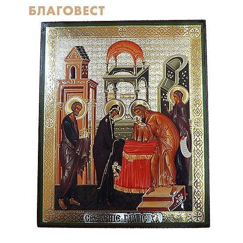 По иудейской традиции женщина после родов должна была принести жертву в свое очищение, поэтому на иконе изображен Иосиф Обручник с жертвенными голубями. Свидетелем события была пророчица Анна.