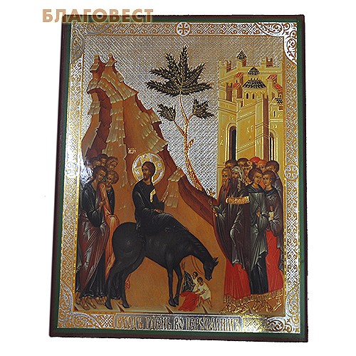 Спасителя встречает множество народа у святого града. «Осанна!» возвещают жители Иерусалима, но лик Господа опечален и отвернулся Он к ученикам, идущим позади.