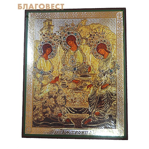 Три Ангела в богатых одеждах, склонив головы, сидят у Престола. Так же, как по преданию три странника явились Аврааму, символизируя непостижимость тайны триипостасности Божества для человеческого разума. Догмат о Пресвятой Троице, который гласит, что "Бог един по существу, но троичен в лицах", живописно отражен на иконе. В молчании склонили они головы перед Жертвенником.