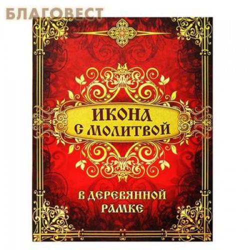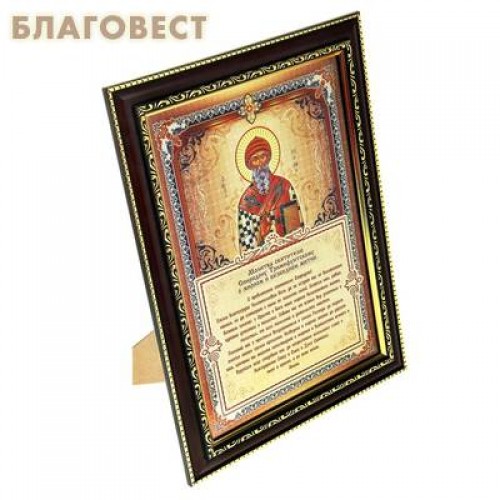 Панно в рамке "Молитва святителю Спиридону Тримифунтскому о мирном и безбедном житии"" состоит из деревянной рамки с пластиковым орнаментом и со стеклом, в которую вставлен фольгированный лист с изображением православной иконы и молитвы. На обратной стороне есть подставка. Панно упаковано в оригинальную коробку.