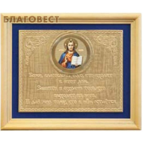 Над молитвой в круглой рамке изображена икона Господа Спасителя нашего. Иисус Христос держит раскрытое Евангелие и осеняет нас благословляющим перстом. С обеих сторон изображение украшено вензелями. Полотно с молитвой обрамлено синей рамкой по периметру и помещено в раму деревянную.