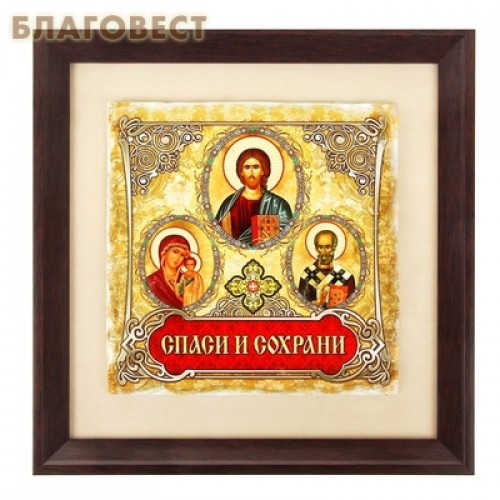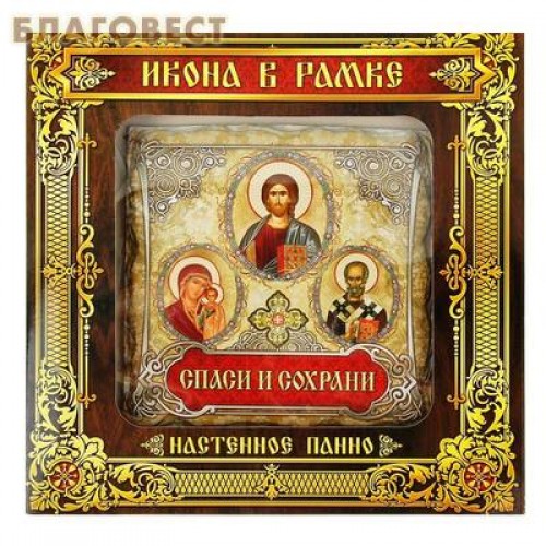 Настенное панно "Спаси и сохрани" выполнено из керамической иконы с нанесение изображений Господа Нашего Иисуса Христа, Пресвятой Богородицы и святителя Николая Чудотворца. Обрамлено панно в качественную деревянную рамку с интерьерными краями.