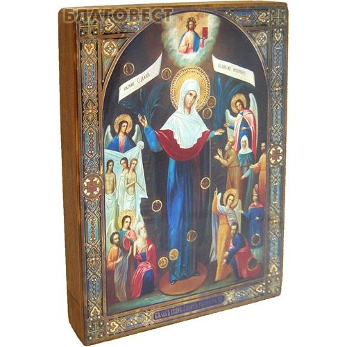 Икона выполнена на деревянной основе (доска). Изображение - наклейка, покрыта лаком. Высокое качество исполнения.