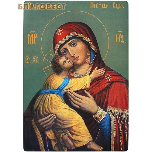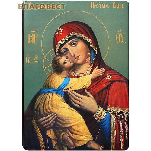 Предлагаем вашему вниманию очень красиво выполненную икону Божией Матери, именуемой Владимирская. Икона имеет полиграфическое исполнение, нанесенное на деревянную основу и покрытое высококачественным лаковым покрытием. Размер иконы – 39,5 на 27,5 см. Она относится к типу икон «Умиление» и есть предание, что впервые она была написана евангелистом Лукой. В Россию ее чудотворный список прибыл из Константинополя в дар Юрию Долгорукому. А Владимирской ее стали именовать уже во время княжения Андрея Боголюбского, когда она чудесным образом сама выбрала место своего пребывания недалеко от Владимира. У этого чудотворного образа есть целых три дня, когда в храмах Русской Православной Церкви совершается ей праздничное богослужение – 21 мая по новому стилю, 23 июня и 26 августа.