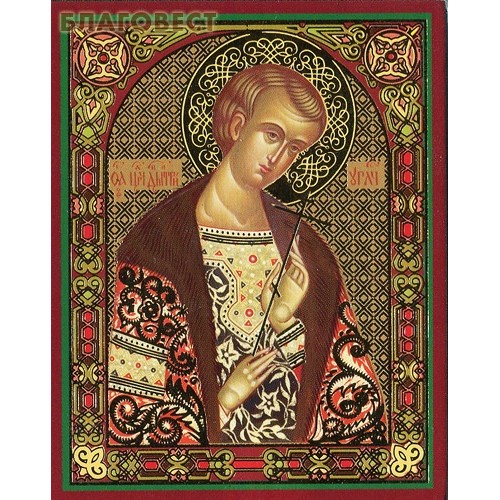 Икона с золотым тиснением на деревянной основе. В комплекте присутствуют описание, молитвы, тропари и величания.