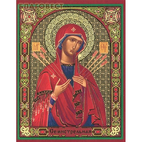 Пророчество святого Симеона Богоприимца о той скорби, которая ждала Божию Матерь у Креста Ее Сына - «Тебе Самой оружие пройдет душу», - символически изображено на «Семистрельной» иконе. Семь мечей, пронзивших сердце Пресвятой Богородицы, означает полноту той скорби, которую Она претерпела в земной жизни.
