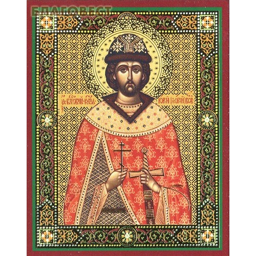 Икона с золотым тиснением на деревянной основе. В комплекте присутствуют описание, молитвы, тропари и величания.
