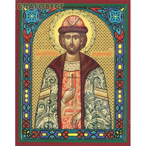 Икона с золотым тиснением на деревянной основе. В комплекте присутствуют описание, молитвы, тропари и величания.