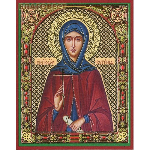 Святая Евгения - римлянка, дочь знатных родителей-язычников. Прекрасно образованная, с привлекательной внешностью, Евгения легко могла бы устроить свое счастье, выйдя замуж за одного из знатнейших людей своего круга, но она не увлекалась мечтами о замужестве. Ее любимым занятием было чтение книг о далеком прошлом Римской империи. Однажды во время вечерней прогулки за городом, она услышала пение христиан, которое произвело на нее сильное впечатление. С этого вечера начались тайные прогулки Евгении к христианам. И чем больше она узнавала о Христе, тем большей любовью горело к Нему ее сердце.