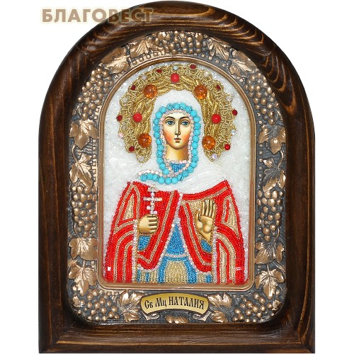 Икона Святой мученицы Наталии изготовлена вручную, риза выполнена из чешского бисера. Арочный киот сделан из массива дерева с портретным стеклом. Багетная вставка – виноградная лоза из скульптурного гипса.