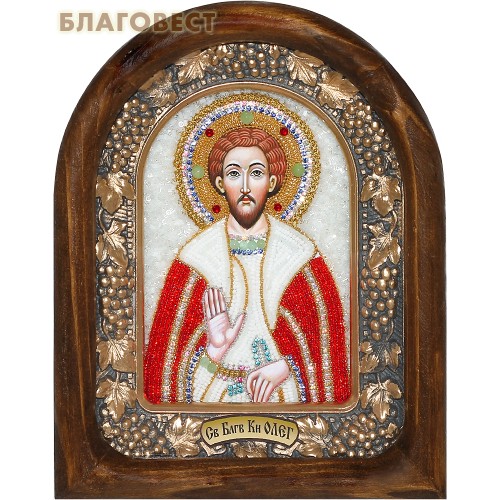 Икона Святого благоверного князя Олега изготовлена вручную, риза выполнена из чешского бисера. Арочный киот сделан из массива дерева с портретным стеклом. Багетная вставка – виноградная лоза из скульптурного гипса.