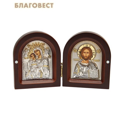 «Благовест» предлагает приобрести двойной складень с образами Христа Пантократора и Богородицы «Достойно Есть». Образы Иисуса и Богородицы нанесены на деревянную основу методом шелкографии. Лицевая часть иконы покрыта серебрением и украшена золотым напылением. Складень, изготовленный греческими мастерами «Silver Axion», следует признать отличным современным образцом церковно-прикладного искусства. Складень аккуратно запакован в подарочную коробку.