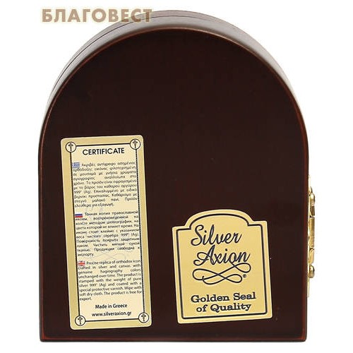 Иконы скреплены между собой прочной металлической петлей. Размер складня в сложенном виде 6,5 на 8 сантиметров. С тыльной стороны имеется сертификат, подтверждающий качество изделия (складень произведен в Греции). Поставляется в добротной подарочной упаковке.