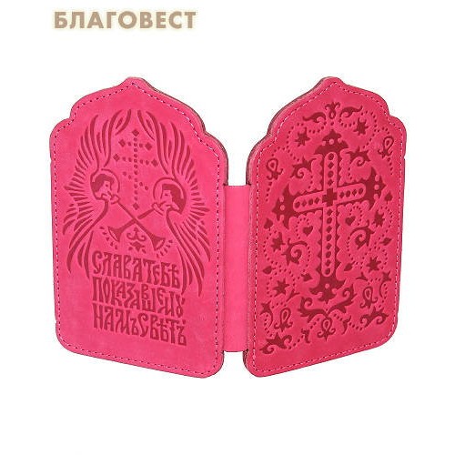 Складень для двух икон выполнен из натуральной кожи малинового цвета. На тыльной стороне методом слепого тиснения выполнено нанесение Креста Животворящего, Ангелов Господних и "Слава" Господу нашему Иисусу Христу.