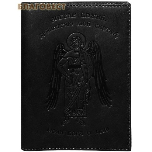 Подарком для христианина-автолюбителя может стать представленная в магазине «Благовест» обложка для надежного сохранения важного документа – водительских прав. Изготовленная из кожи обложка окрашена в черный цвет. На передней стороне обложки методом слепого (блинтового) тиснения изображена фигура Ангела Хранителя и надпись, известная из Молитвослова: «Ангеле Божий, Хранителю мой святый, моли Бога о мне!». На задней стороне в той же технике тиснения нанесены слова из Псалома 90.