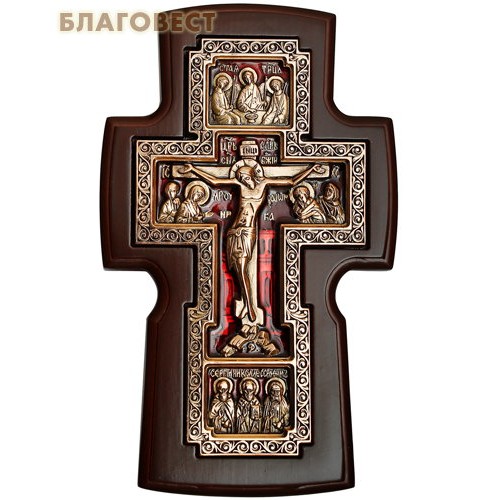 Резной деревянный настенный крест изготовлен из ольхи с применением гальванопластики и добавлением ювелирной эмали. Высота креста – 23,5 сантиметра.