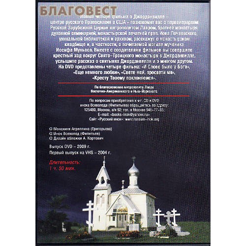 Новые четыре фильма о Джорданвилле — центре русского Православия в США — познакомят вас с первоиерархом Русской Православной Церкви За рубежом митрополитом Лавром, братией монастыря, святынями Джорданвилля, духовной семинарией, монастырской печатней преп. Иова Почаевского, уникальной библиотекой и архивом, расскажут о монастырском кладбище, и, в частности, о почитаемой могиле мученика Иосифа Муньоса. На DVD представлены четыре фильма: «И Слово было у Бога», «Еще немного любви», «Свете мой, просвети мя», «Кресту Твоему поклоняемся».