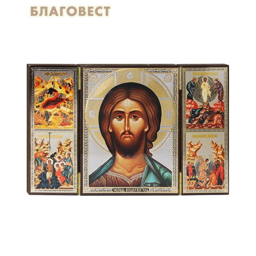 На центральной Иконе изображен Господь Вседержитель. Его образ являет собой всесильность и многоликость Спасителя, а также строгость и сострадание Иисуса. На створках изображены сцены жизни Господа Нашего - Рождество, Крещение, Воскресение и Преображение. С внешней стороны створок изображен Крест и нанесены слова из Евангелия.