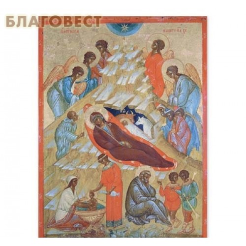 В центре композиции изображается пещера, в которой лежит Богомладенец Христос. Рядом над ним фигура Богоматери и снизу – животных, которые поклоняются родившемуся Богочеловеку. Композиционно пещера с фигурой Христа и Богоматери выступает центром, вокруг которого изображается поклонение всего живого родившемуся по плоти Господу. Вот преклонили колени волхвы с востока, принесшие подарки Богомладенцу – ладан, смирну и золото. Рядом с ними иконописец изображает пастухов, которым явился ангел, возвестивший о рождении Спасителя. С другой стороны поклонились Богомладенцу силы небесные – ангелы, а над всей композицией парит Святой Дух и луч Вифлеемской Звезды, который ниспадает на место, где родился Христос.