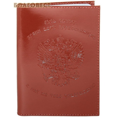 Обложка для водительского удостоверения изготовлена из натуральной глянцевой кожи коньячного цвета. На лицевой части изделия выполнено тиснение Герба Российской Федерации и изречение исповедника и святителя Афанасия (Сахарова), епископа Ковровского «Русь Святая храни веру православную…».