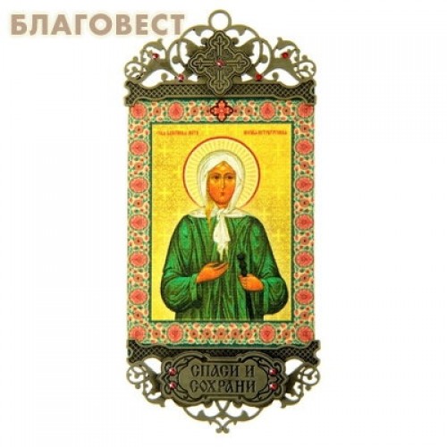 Икона-хоругвь «Блаженная Ксения Петербургская» - это лик, нанесенный полноцветной печатью на плотный холст. Ткань прикреплена к подвесам из металла, покрытым бронзовой краской и украшенным стразами. В верхней части есть специальное колечко, с помощью которого икону можно надежно прикрепить к стене.