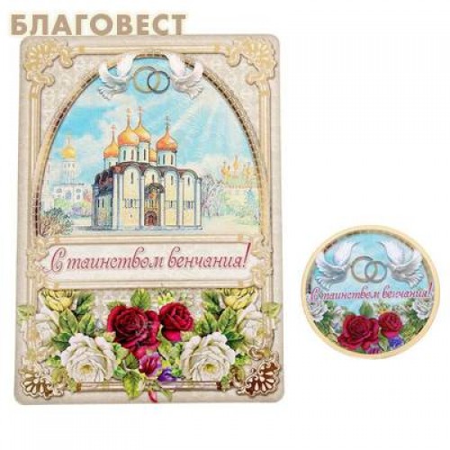 Магнит на открытке станет приятным дополнением к подарку в день совершения Таинства.Дополнен красочной открыткой, на обороте которой Вы можете написать самые искренние пожелания и добрые слова венчающимся супругам.