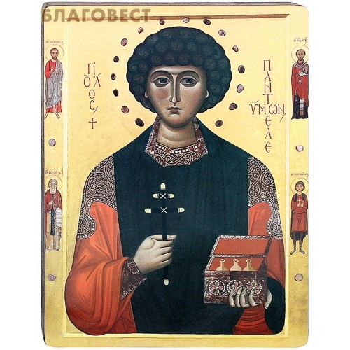Предлагаемая икона святого великомученика и целителя Пантелеимона выполнена на дереве и имеет размер 30,5 на 22 см. Изображение святого выполнено на золотом фоне, в руках он держит крест Христов и ковчежец с лекарствами, а по бокам на полях помещено еще четыре изображения разных святых. Память святого празднуется Православной Церковью 9 августа по новому стилю. Этот святой – один из самых известных и любимых всеми православными людьми. Именно к нему в первую очередь обращаются все, кто хочет получить телесное здравие или хотя бы облегчение в болезни. Это происходит потому, что из его жития мы знаем, что еще при жизни святой Пантелеимон многих исцелил не только своим врачебным мастерством, но и силой молитвы, обращенной ко Господу.