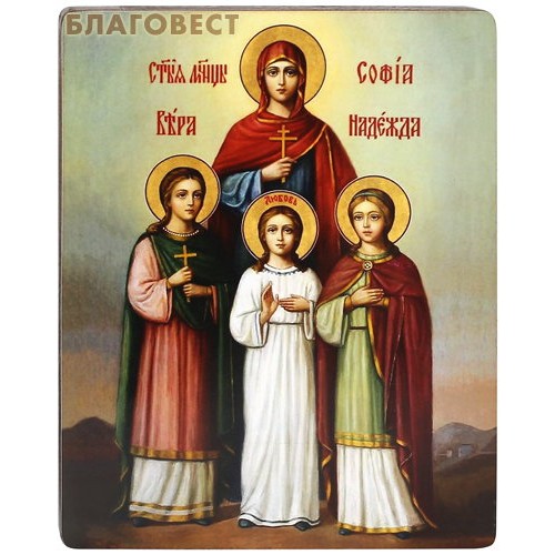 Икона "Святые мученицы Вера, Надежда, Любовь и мать их София". Полиграфия, дерево, лак