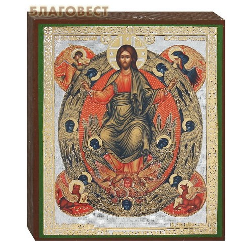 На иконе изображен Спаситель в центре геометрических фигур. Данная икона занимает центральную часть иконостаса, т.к. соединяет в себе божественное и земное начала Вседержителя. Круг представляет бесконечное Царство Небесное. По периметру круга изображены ангелы. По краям находятся символы четырех евангелистов: ангел, лев, орел и телец. Иисус Христос восседает на престоле. Руки его обращены в стороны.
