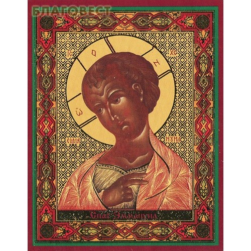 Икона с золотым тиснением на деревянной основе. В комплекте присутствуют описание, молитвы, тропари и величания.