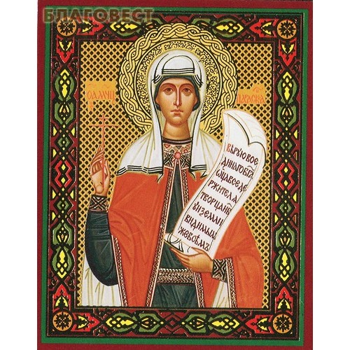 Икона с золотым тиснением на деревянной основе. В комплекте присутствуют описание, молитвы, тропари и величания.