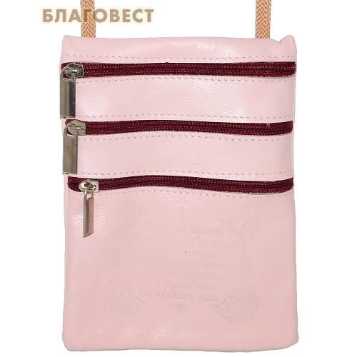 Сумка паломника нагрудная с тиснением молитвы Кресту, три молнии с внешней стороны. Кожа, цвет светло-розовый