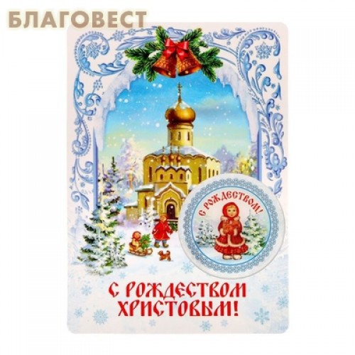 Сияющий магнит с золотым тиснением и заливкой смолой дополнен красочной открыткой. Напишите на её обороте свои самые искренние пожелания и добрые слова, чтобы затем подарить сувенир близкому человеку на праздник Рождества Христова. Магнит прикреплён к открытке на двустороннюю клейкую ленту, он легко удаляется, не оставляя следов.