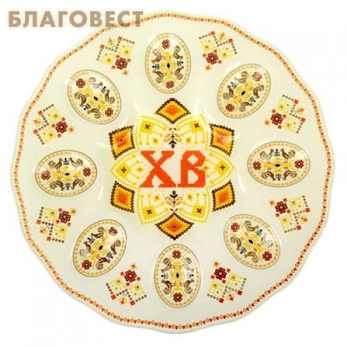 Фигурная керамическая подставка под шесть яиц — будет прекрасным семейным подарком к празднику Пасхи. Подставка расписана в стиле, имитирующим народную вышивку ткани крестиком в красных, желтых, белых, зеленых, коричневых и черных тонах. В овальных выемках для яиц помещены изображения красных цветов и зеркальные рисунки курочек (по четыре в каждом овале). В центре шестиконечного вида звезды красной краской выделены буквы «ХВ» («Христос Воскресе»). По краю подставка украшена красной каемкой из чередования ромбиков и крестиков.