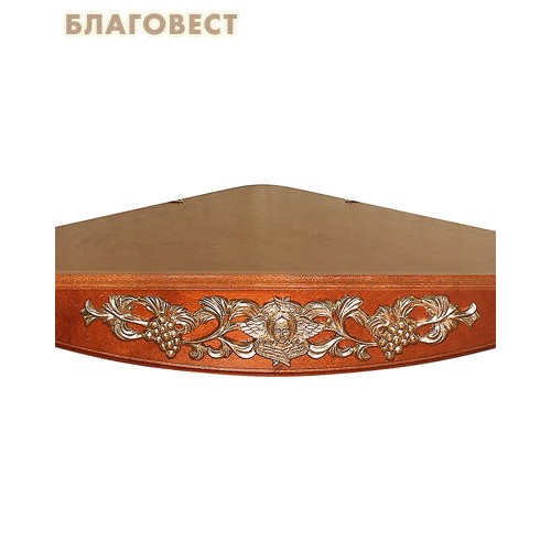 Фасад одноярусной угловой полки для икон изготовлен из натурального дерева цвета орех. Украшено изделие ажурным лепным узором с изображением шестикрылотого Серафима - ближайшего из чинов ангельских к Богу, как наше стремление приблизиться к нему.