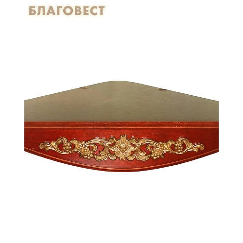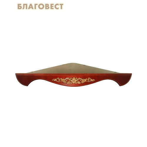 Одноярусная угловая полка для икон изготовлена из натурального дерева вишневого цвета. Украшено изделие ажурным лепкой Серафима шестикрылатого - ближайшего из чинов ангельских к Богу, как наше стремление приблизиться к Нему и растительного узора. Основная часть, площадь для икон изготовлена из фанеры.