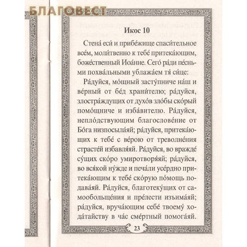 Настоящее издание содержит акафист, посвященный святому пророку и Крестителю Господню Иоанну Предтече. Шрифт — гражданский (русский), с ударениями, достаточно крупный. Святой Иоанн Креститель и Предтеча Господень, предсказавший приход Христа в мир - последний ветхозаветный пророк и первый святой Нового Завета. В детстве Иоанн отправился жить в пустыню. Постом и молитвой он готовил себя к великому служению. Сила проповеди Иоанна о покаянии заставила многих людей креститься. Народ спрашивал, не является ли сам Иоанн Христом Избавителем? Иоанн отвечал: «Я крещу вас водой, но идет Сильнейший меня, у Которого я недостоин развязать ремень обуви; Он будет крестить вас Духом Святым и огнем». Сам Иисус Христос крестился у Иоанна и Крещение Его сопровождалось чудесными знамениями - схождением Святого Духа в виде голубя и голосом Бога Отца с неба: «Сей есть Сын Мой возлюбленный... Святой пророк принял мученическую смерть от царя Ирода, по приказу которого Иоанну отрубили голову.