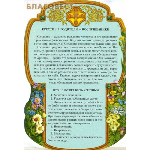 Брошюра кратко расскажет о Таинстве Крещения, крестных родителях и их обязанностях, об именинах, дне ангела, о главных христианских заповедях и основных христианских молитвах. | |