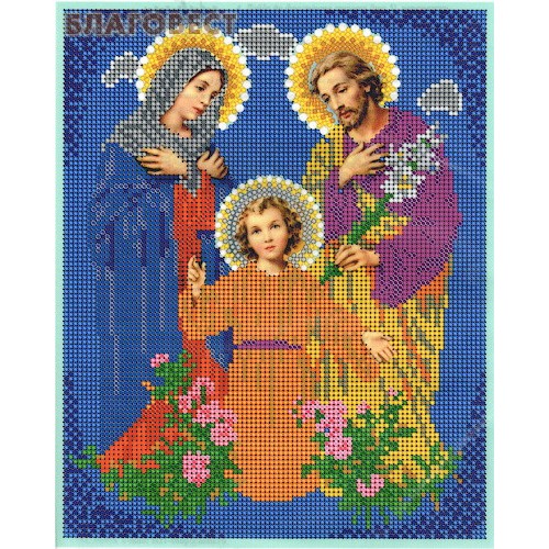 Рисунок на ткани для вышивания бисером "Святая Семья" символично изображает юного Иисуса Христа. Правая рука его сложена в благословляющем жесте. По правую руку от Спасителя к нему склонилась Богородица, молитвенно сложив на груди руки. По левую руку склонил голову Иосиф. Правую руку он приложил к груди, а в левой держит цветы. Внизу подле Иисуса цветут бутоны роз. Все изображение выполнено на синем фоне.