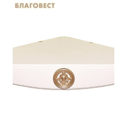 Фасад одноярусной угловой полки для икон изготовлен из натурального дерева, покрытого белой краской. Украшено изделие ажурным лепным кругом с изображением шестикрылотого Серафима - ближайшего из чинов ангельских к Богу, как наше стремление приблизиться к нему. Основная часть, площадь для икон изготовлена из фанеры.