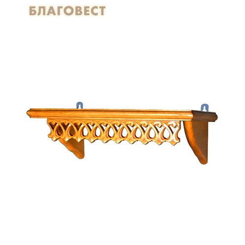Одноярусная полка для икон изготовлена из натурального дерева, украшена ажурной вставкой по нижнему краю. Данное изделие великолепно дополнит интерьер в любой комнате и просто незаменимо при создании небольшого домашнего иконостаса, в «красном» углу Вашего дома.